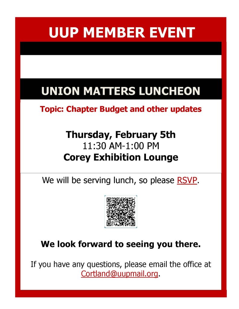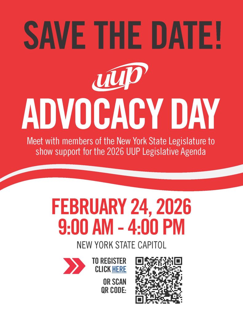 February 24th from 9:00am to 4:00pm. Meet with the members of the NYS Legislature to show support for the 2026 UUP Legislative Agenda. It will take place in the New York State Capitol, Albany NY. Please see the flyer on the UUP bulletin board to register or go to the UUP Statewide website.