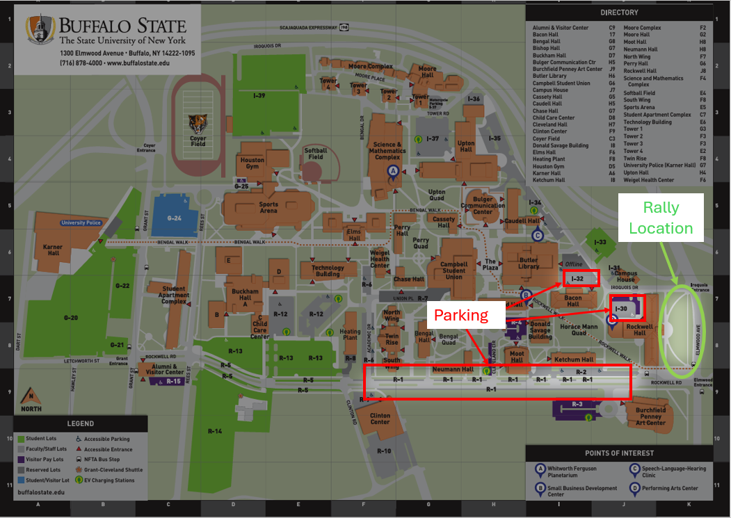 For those planning to attend the Buffalo State Rally on Tuesday, March 10 at 12:15 – 1:30, we have received information on where to park and event location information. The Rally itself will take place outside of Rockwell Hall (across from the AKG Museum of Art). On the map below the location is indicated in green. Please park in lots I-32, I 30, R-1 or R-2 (locations marked in Red). DO NOT PARK IN THE AKG MUSEUM PARKING. I look forward to seeing as many of you that can get away.
